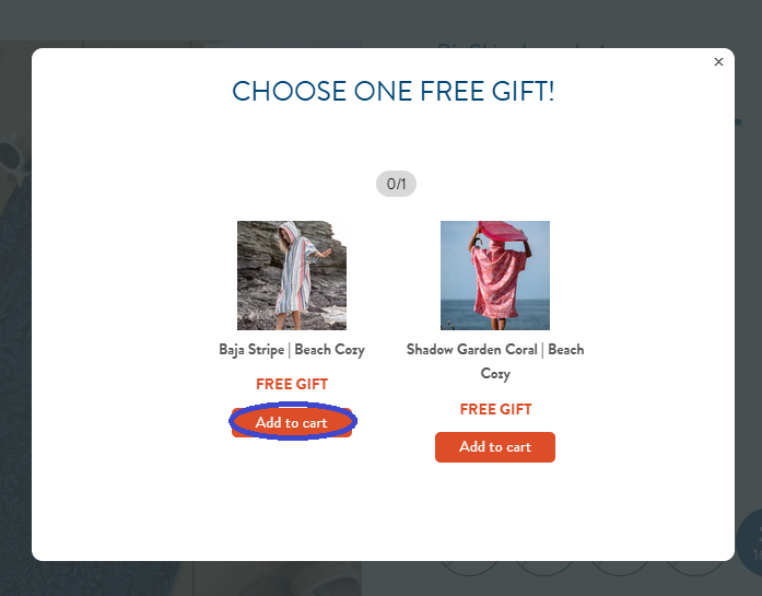 - When your cart reaches $100, a pop-up will guide you to adding the free gift to your cart. You can choose between the Baja Stripe or Shadow Garden Coral Beach Cozy.